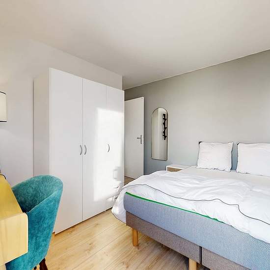 This spacious and comfortable room has been designed for you dear roomie! Practical and functional, the room is equipped with high quality bedding (140x200cm), a beautiful wardrobe, a night table and a true office space for your exams or your home office days! All of this in a cheerful and warm atmosphere. In addition, you have access to a shared bathroom and a shared balcony. Beautiful flatshare in Champs-sur-Marne ! Discover Champs Aubépine, our cosy and freshly renovated contemporary-style apartment. Close to local shops and restauran...