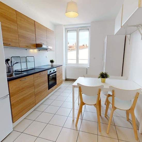 Super coloc meublée avec 3 chambres LE LOGEMENT Superbe et très lumineuse colocation de 3 chambres de 65m2 entièrement rénovée, située dans le 3ème arrondissement de Lyon, dans un quartier dynamique et commerçant, au 4e étage (avec ascenseur) de la résidence du 23 Rue Paul Bert. LA CHAMBRE Superficie : 10 m2 Aménagement totalement optimisé et fonctionnel avec un lit double, un bureau, une chaise et une table de chevet + gd placard encastré. ESPACES COMMUNS Cuisine ouverte et entièrement équipée Loggia (terrasse couverte) Salle à manger Salon...