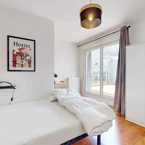 This spacious and comfortable room has been designed for you dear roomie! Practical and functional, the room is equipped with high quality bedding (140x200cm), a beautiful wardrobe, a night table and a true office space for your exams or your home office days! All of this in a cheerful and warm atmosphere. In addition, you have access to a shared bathroom and a shared terrace. Beautiful flatshare in Nanterre ! Discover Nanterre Metz 2, our cosy and freshly renovated contemporary-style apartment. Close to local shops and restaurants, it is ea...