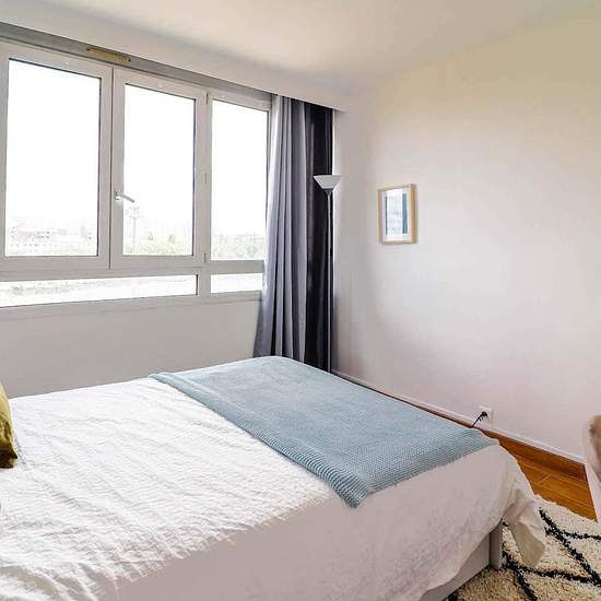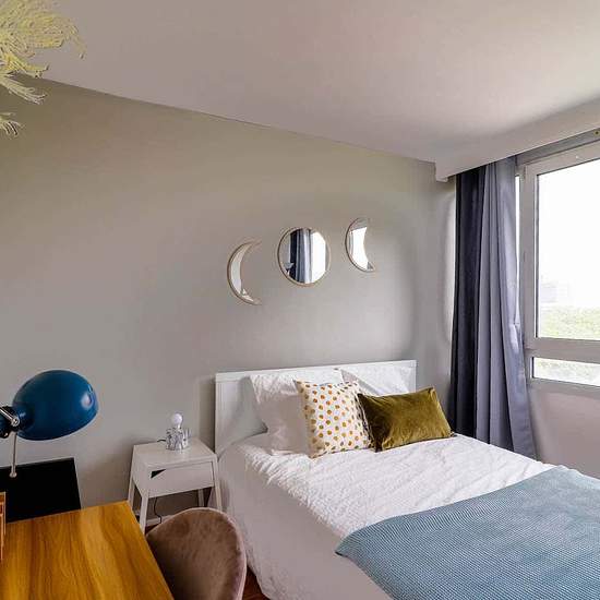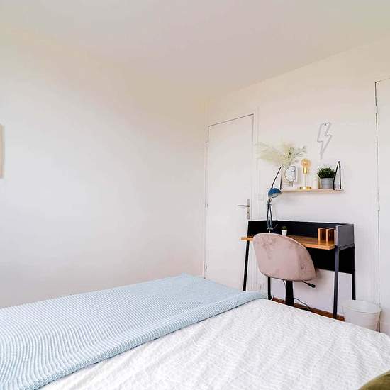 [FR] Nous vous proposons cette ravissante chambre de 10m² à louer. C’est au 10ème étage d’un immeuble résidentiel et sécurisé, dans un appartement de 75m² que se situe cette chambre à la vue dégagée sur Paris. Sa décoration aux accents industriels, ponctuée de blanc et de gris acier, lui confère toute sa singularité. Ces couleurs délimitent également les deux espaces de cette chambre. Le premier espace se compose d’un bureau et de ses équipements indispensables (chaise, étagères, lampe). Le second est l’essentiel espace nuit qui se compose d...