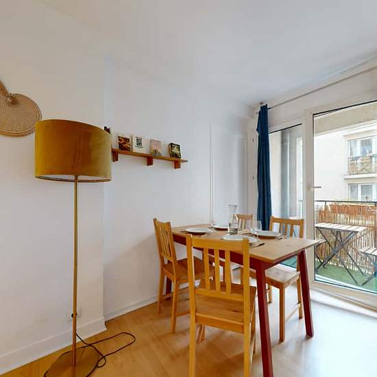 Sur la face Nord de la butte Montmartre, nous vous proposons un appartement fonctionnel au 2e étage. Ce logement est composé de trois chambres louées séparément et équipées de tout le linge de lit et de toilette nécessaire. Chaque chambre est dotée d'un lit double, d'un bureau et d'une armoire, d'un fauteuil, de rideaux et volets et est décorée avec goût. Les espaces partagés sont constitués d'une cuisine entièrement équipée (lave-vaisselle, four, micro-ondes,...), d'une petite salle à manger, d'une salle de bains avec baignoire, de toilette...