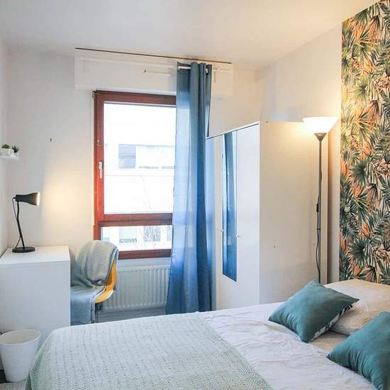 [FR] Chambre de 10m², entièrement meublée. Elle dispose d’un lit double (140x190) accompagné d'une table de chevet avec lampe. Un espace de travail est disponible, composé d'un bureau avec chaise et lampe. La chambre propose également plusieurs rangements : une armoire avec penderie et une étagère. Situé dans le quartier Les Martinets cet appartement de 90m² bénéficie d’un emplacement idéal, à deux pas du Parc des Impressionnistes et de la station de RER et à proximité de toutes les commodités. L’appartement se trouve au 6ème étage d’un imme...