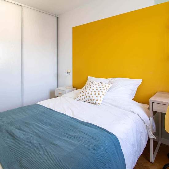 [FR] Découvrez cette confortable chambre de 10m² à louer au cœur d’un grand appartement de 90 m². C’est au 6ème étage d’un immeuble résidentiel de Saint-Denis que se trouve cette chambre, entourée des commodités (marché, épiceries, bars, restaurants, etc.) et des transports en communs. L’arrêt “Front Populaire” de la ligne de métro 12 se trouve à seulement 10 minutes de marche de votre chambre. Afin de concorder avec le calme de sa vue sur cour, nous avons opté pour une décoration dans des teintes vert amande et moutarde. Elles délimitent l’...