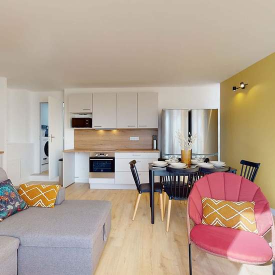 This spacious and comfortable room has been designed for you dear roomie! Practical and functional, the room is equipped with high quality bedding (140x200cm), numerous storage spaces (bed drawers, closet, shelves and night table) and a true office space for your exams or your home office days! All of this in a cheerful and warm atmosphere. In addition, you have access to a shared bathroom. Discover Villejuif Paul Bert, our cosy and freshly renovated contemporary-style apartment. Close to local shops and restaurants, it is easily accessible ...