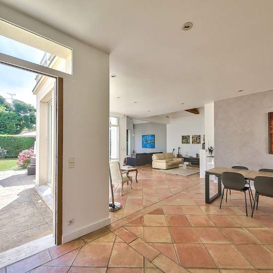 A propos de ce bien Quartier Alsace A 10 mn du RER au calme, Magnifique maison moderne meublée ou vide d'une superficie de 282 m² sur un terrain d'environ 1.200 m², terrasses et grand jardin arboré situés Sud/Ouest comprenant : au rez-de-chaussée une vaste entrée, une triple réception avec cheminée, cuisine aménagée équipée dinatoire ouverte sur le séjour, le tout d'une superficie d'environ 112 m², une arrière cuisine équipée également, L'espace cuisine et salon bénéficient de grandes baies vitrées et donnent accès aux terrasses et aux jard...
