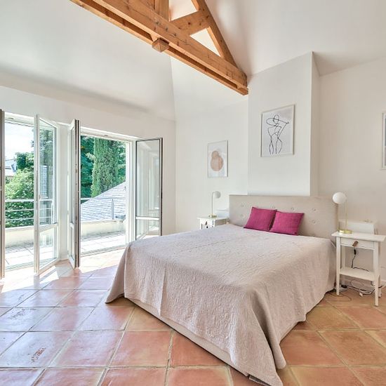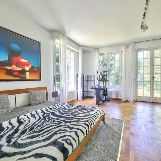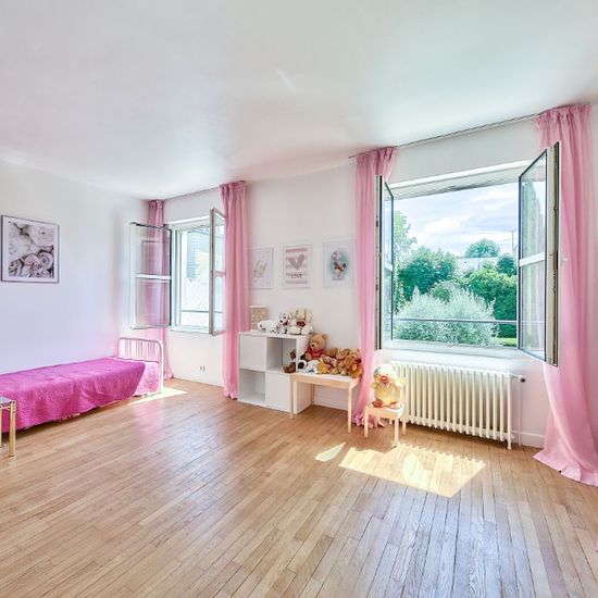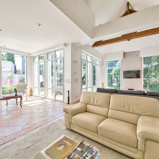 Quartier Alsace A 10 mn du RER au calme, Magnifique maison moderne meublée ou vide d'une superficie de 282 m² sur un terrain d'environ 1.200 m², terrasses et grand jardin arboré situés Sud/Ouest comprenant : au rez-de-chaussée une vaste entrée, une triple réception avec cheminée, cuisine aménagée équipée dinatoire ouverte sur le séjour, le tout d'une superficie d'environ 112 m², une arrière cuisine équipée également, L'espace cuisine et salon bénéficient de grandes baies vitrées et donnent accès aux terrasses et aux jardins (sud), Une grande...