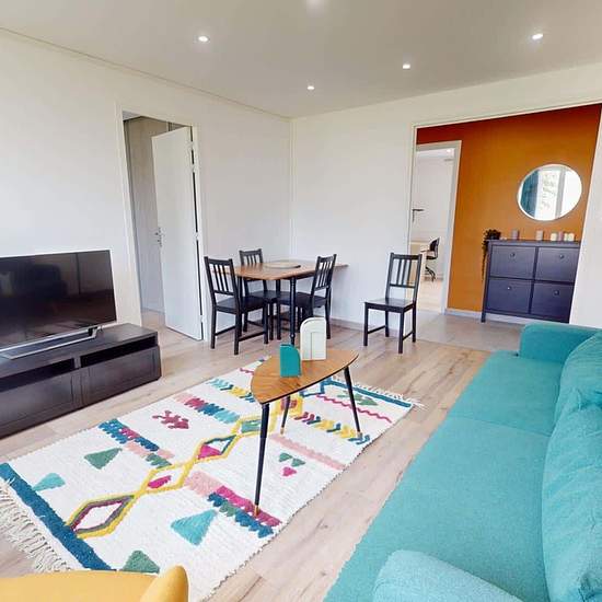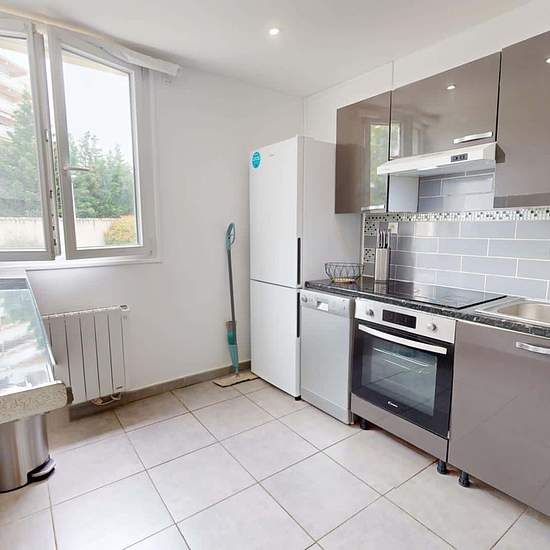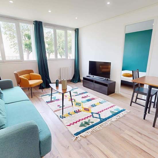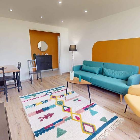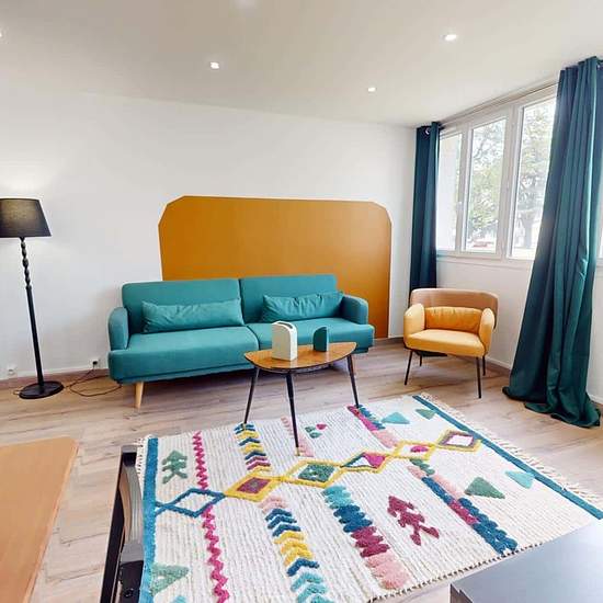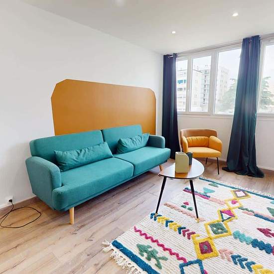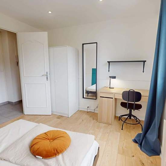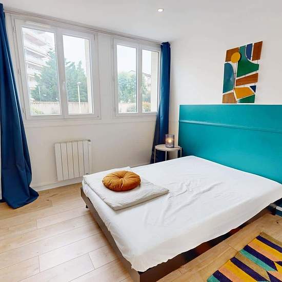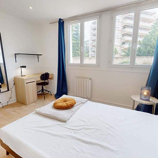 OQORO vous présente cette colocation de 3 chambres de 63 m² située au 43 Rue Docteur Albéric Pont à louer au 43 Rue Docteur Albéric Pont (Lyon). LA CHAMBRE La chambre est louée avec une armoire, un bureau avec sa chaise, un miroir et un lit double. Cette chambre est lumineuse grâce à deux grandes fenêtres. LES ESPACES COMMUNS Cet appartement de quatre pièces dispose des espaces suivants : Un salon chaleureux qui dispose d'un canapé, d'une lampe, d'une table basse, d'un meuble Tv avec sa télévision, d'une table à manger avec ses quatre chaise...