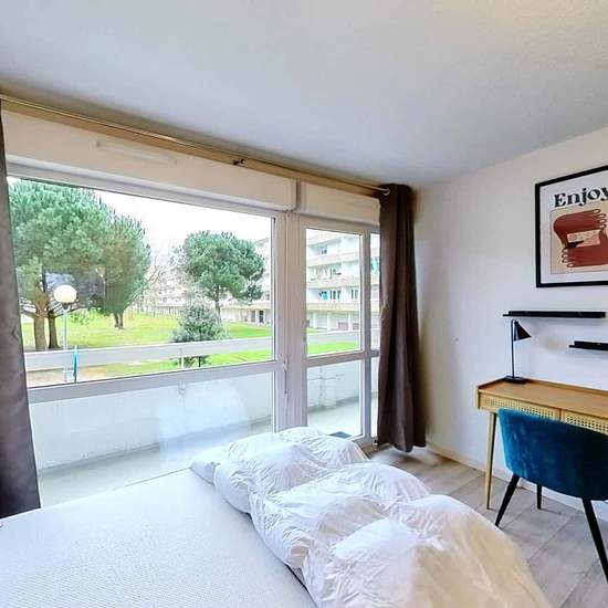 This spacious and comfortable room has been designed for you dear roomie! Practical and functional, the room is equipped with high quality bedding (140x200cm), a beautifull wardrobe, a night table and a true office space for your exams or your home office days! All of this in a cheerful and warm atmosphere. In addition, you have access to a shared bathroom. Beautiful flatshare in Talence ! Discover Talence Peydavant, our cosy and freshly renovated contemporary-style apartment. Close to local shops and restaurants, it is easily accessible...