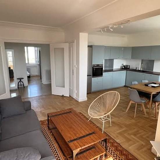 Loue chambre dans une colocation de 3 personnes, à Grand Clément (Villeurbanne, proche Montchat) dans appartement entièrement rénové, situé au 7ème et dernier étage, avec ascenseur. Meublé avec goût et très bien équipé : dressings, bureaux, couettes, TV, box internet, cuisine full équipée... Bien très lumineux, de 80m2 calme, avec une grande terrasse ainsi qu’un autre balcon, sans vis-à-vis. Parking + cave 570 € charges comprises (eau froide, eau chaude, chauffage collectif, box avec fibre). Dispo immédiate Possibilité APL / ALS. Gare P...
