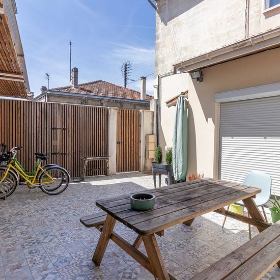 Idéalement située à moins de 10 minutes à pied du tram B entre les arrêts Barrière St Genès et Roustaing, maison en colocation, entièrement meublée de 185m². La maison est composée : – d’une pièce de vie de 30m² avec cuisine ouverte entièrement équipée (réfrigérateurs/congélateurs, deux plaques de cuisson, deux hottes, un four) ; – de 3 salles d’eau avec douche à l’italienne à partager et deux salles d’eau privatives ; – de 3 WC séparés ; – de 12 chambres avec penderie, lit double, bureau et lavabos privatifs. 1 chambre se libère : Chambre 6...