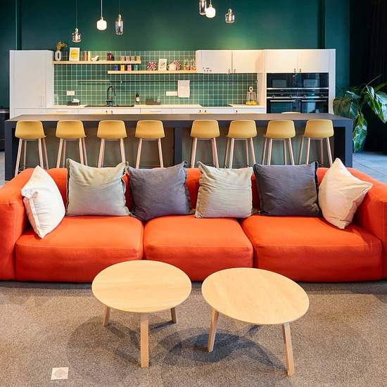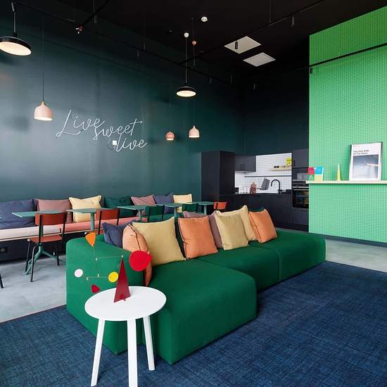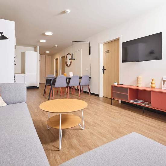 EN: The room features a 140x200 bed with bed base, mattress, mattress protector and cover, duvet, and headboard. It also includes a wardrobe, walk-in closet, mirror, and bedside table, offering plenty of storage space. Bathroom: Shared bathroom with storage space, towel dryer, washer/dryer, and mirror. Living Area: Shared living area furnished with a sofa bed, coffee table, chair, and console table—ideal for relaxing or socializing. Kitchen: Fully equipped shared kitchen with fridge and freezer, combined microwave oven, ceramic hob, dishwash...
