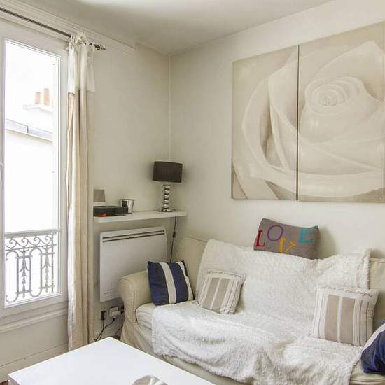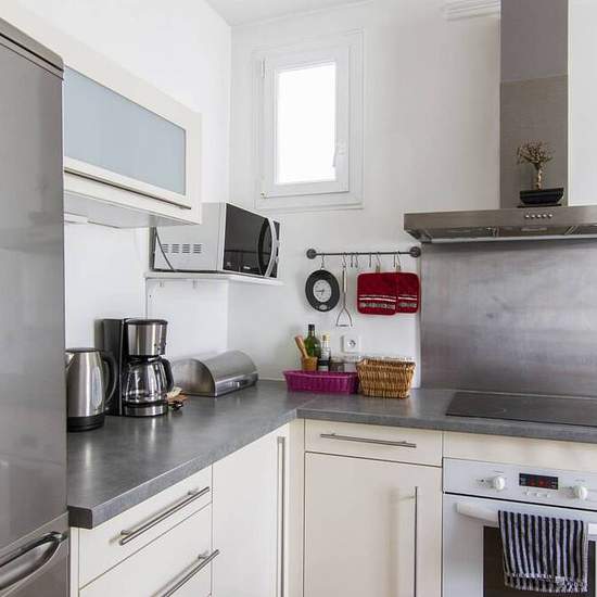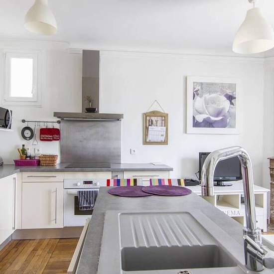This 2-bedroom apartment with Parisian decor consists of a living room, a kitchen and a bathroom. The living room comes furnished with a large sofa facing the TV, beside the fireplace. The kitchen is modern and comes fully equipped. The space also includes an island table where you can have your delicious meals. The apartment is spacious and bright due to the large windows. Around the area, you can find several restaurants and bars from different nationalities such as Deux fois plus de piment which is a Chinese restaurant and El Diablito La...