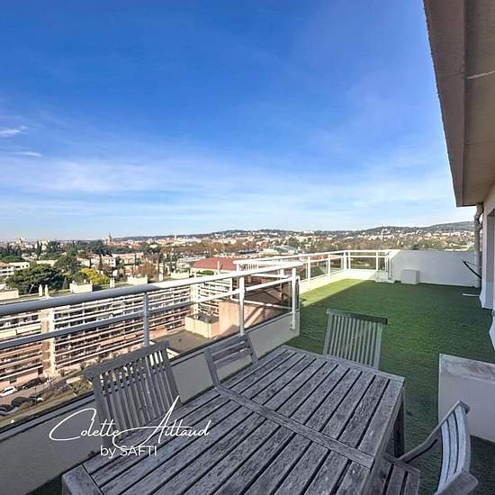 ? Aix-en-Provence Tour d'Aygosi Dans une résidence sécurisée située à deux pas du parc de la Torse et du parc des Sports, se trouve ce magnifique rooftop meublé de 56 m², prolongé par une superbe terrasse en L de 51 m² qui offre une véritable respiration sur l'extérieur. L'appartement, entièrement climatisé, se compose d'une vaste pièce de vie lumineuse avec une cuisine équipée et un salon donnant directement sur la terrasse. Il dispose également d'une belle chambre indépendante, d'une salle d'eau à l'italienne et de WC séparés, offrant co...