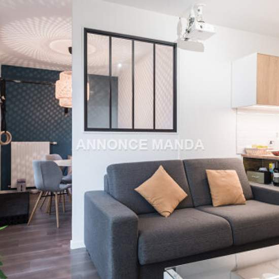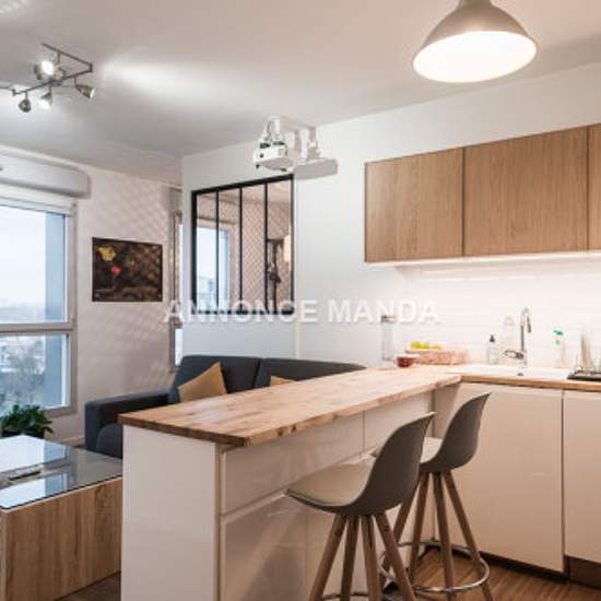 Logement Manda ! À 15 minutes de la gare du Vert de Maisons, Manda vous propose un T2 bis Rue Nelson Mandela. Situé au 7ème et dernier étage avec ascenseur, cet bel appartement vous sera loué meublé. L'entrée donne dans un couloir et dispose d'un petit meuble de rangement. Le salon propose un canapé, une table basse et une grande fenêtre qui donne sur un espace vert. À côté, accessible par une ouverture sans porte, vous trouverez un coin salle à manger/bureau avec une table et quatre chaises. Une verrière entre le salon et la salle à manger ...