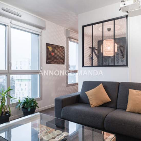 Logement Manda ! À 15 minutes de la gare du Vert de Maisons, Manda vous propose un T2 bis Rue Nelson Mandela. Situé au 7ème et dernier étage avec ascenseur, cet bel appartement vous sera loué meublé. L'entrée donne dans un couloir et dispose d'un petit meuble de rangement. Le salon propose un canapé, une table basse et une grande fenêtre qui donne sur un espace vert. À côté, accessible par une ouverture sans porte, vous trouverez un coin salle à manger/bureau avec une table et quatre chaises. Une verrière entre le salon et la salle à manger ...