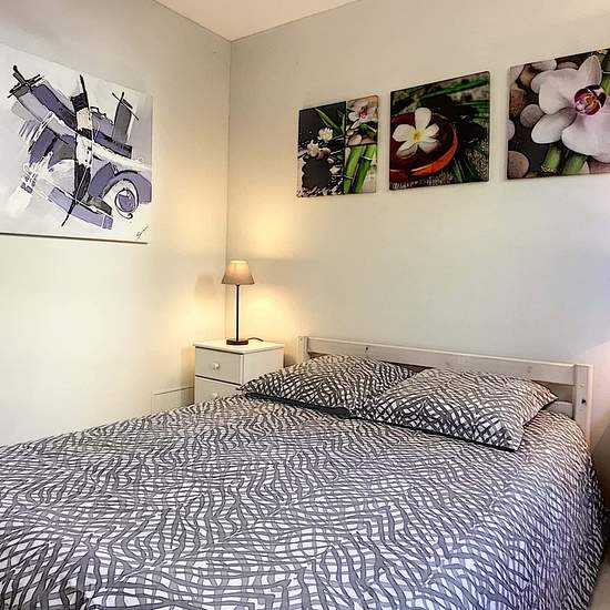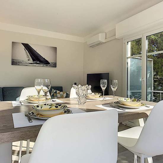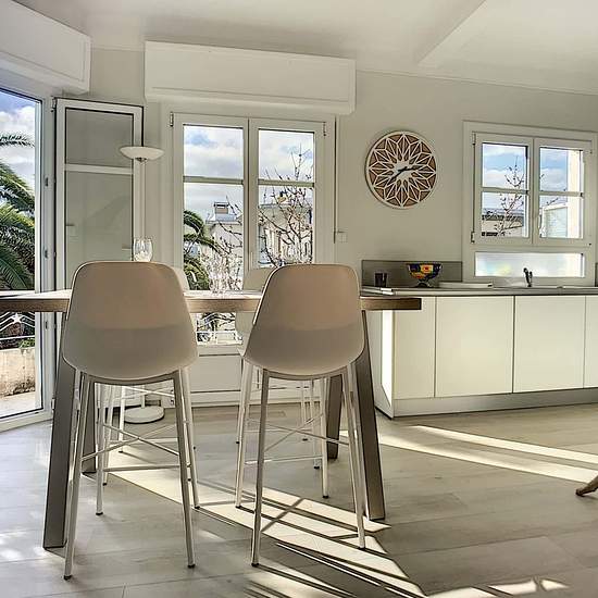 The space Magnificent apartment, 70sqm, entirely renovated, with air-conditioning in each bedroom. In a very quiet and calm location, just 150m to the surrounding beaches and 5min to the centre of town in Juan Les Pins The apartment comprises of : An entry opening up to a bright living area with lounges with stools, tv and dining table. Access to the terrace which runs the length of the apartment. An open kitchen fully equipped with four burner stove, fridge, microwave, dishwasher, kettle, toaster, coffee machine, and all necessary. utensils...