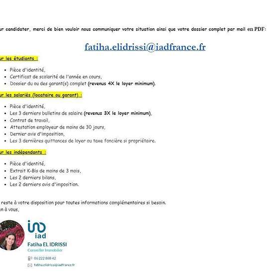 Iad France - Fatiha El Idrissi () vous propose : LOCATION VIDE o Contact par MAIL ou SMS UNIQUEMENT. Merci ! (Tout est dans l'annonce). o DOSSIER COMPLET PAR MAIL EN PDF AVANT VISITE : (VOIR ADRESSE MAIL SUR LA 2ème photo). o BIEN EN LIGNE = BIEN DISPONIBLE = inutile d'appeler pour demander la disponibilité! o MERCI DE VOUS PRÉSENTER LE PLUS PRÉCISÉMENT POSSIBLE LORS DE VOS DEMANDES D'INFORMATIONS : Profession, salaires, type de contrat, .... o CONDITIONS : Salariés CDI UNIQUEMENT avec revenus égale ou supérieur à 3X le loyer ou ETUDIANTS av...