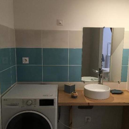 BORDEAUX, 950 Euros + charges 65 Euros Appartement T2 neuf de 48 m2. Avec Terrasse, et place de parking. Ascenseur. Comprenant entree, salon, cuisine Americaine equipee, une chambre, salle de bain, salle d'eau, WC. Proche transports et commerces. Caution : 2 mois HC. Zone soumise a encadrement des loyers. Loyer de reference : 18 Euros /m2. Loyer de reference majore : 22 Euros /m2. Nous contacter LADP fd 210 Euros