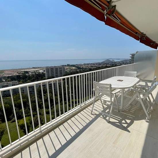 Cagnes sur Mer. Dans résidence de standing, fermée, sécurisée, parc 22 hectares, club house, piscine olympique, tennis 3 pièces meublé en étage élevé de 80m², traversant, vue mer panoramique, cuisine entièrement équipée donnant sur un balcon, séjour avec grande terrasse, calme absolu, 2 chambres, salle de douche. Cave et parking couvert. Ce bien est disponible dès maintenant. Loyer 1810 Euros + 190 Euros de charges = 2000 Euros TTC. Honoraires: 1040 Euros. Caution : 3620 Euros. Afficher le téléphone