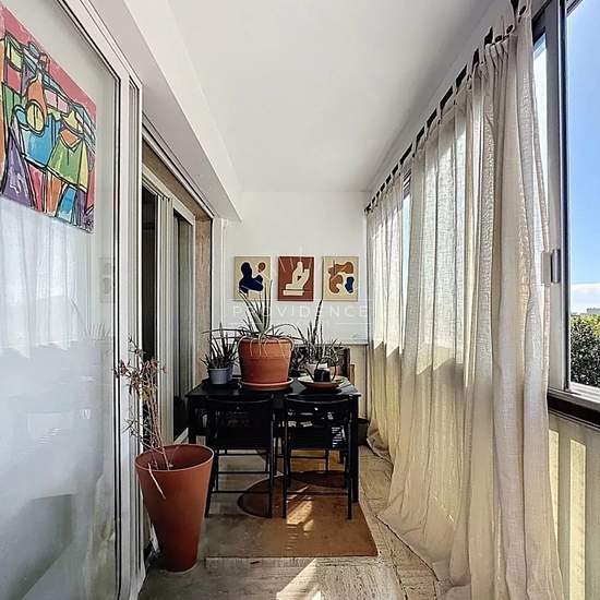 Situé au 3ème étage avec ascenseur, cet appartement de 59 m² dispose d'une loggia de 10 m² avec aperçu mer. Entièrement rénové, il a été conçu sur mesure avec des aménagements intégrés de qualité. Il se compose d'un hall d'entrée, d'une cuisine contemporaine entièrement équipée, d'un séjour spacieux avec coin bureau, d'une chambre avec rangements intégrés, d'une salle de douche rénovée et de la loggia de 10 m². Orienté plein sud, il bénéficie d'une belle luminosité et d'une vue dégagée. Entièrement climatisé, y compris sur la loggia, il offr...
