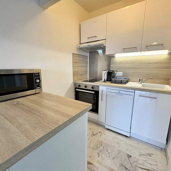 A louer à Cannes, un 2 pièces meublé, 1200€/mois, Rue Lacour, proche croisette, 12m2 de Terrasse au 5ème étage, excellent état, cuisine très bien équipée, climatisation, résidences sécurisées avec gardien, voir les nombreuses photos, Libre de suite EMAIL