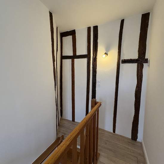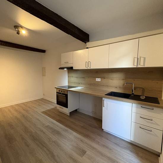 APPARTEMENT ENTIEREMENT REFAIT EN CENTRE VILLE 2 PIECES DUPLEX COMPRENANT : AU REZ DE CHAUSSEE: UNE PIECE PRINCIPALE AVEC COIN CUISINE SEMI-EQUIPEE; AU 1ER ETAGE : UN COIN NUIT AVEC PLACARD, UNE SALLE D'EAU AVEC WC, UNE CAVE