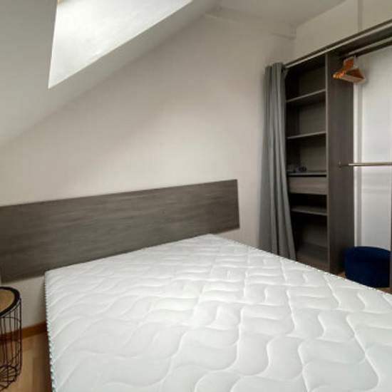 Appartement MEUBLÉ au 2ème étage comprenant : une entrée desservant une chambre avec lit double et penderie, une pièce supplémentaire pouvant servir de dressing ou de bureau et une cuisine aménagée et équipée (plaques, frigo top, micro-ondes et vaisselle), bar avec tabourets, ouverte sur le salon avec canapé, table basse, meuble TV. Une salle d'eau avec wc. Chauffage électrique. Velux bois double vitrage. CHARGES = TOM + COMMUNS « Les informations sur les risques auxquels ce bien est exposé sont disponibles sur le site Géorisques : ».