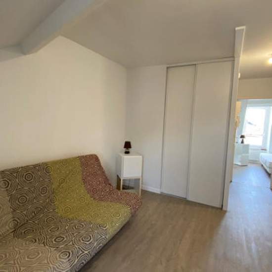 Appartement comprenant: un séjour partiellement meublé, canapé, table, chaises avec coin cuisine équipé (frigo top, plaques électriques, hotte), 1 chambre avec un lit double, une salle de bains avec wc. Chauffage électrique. Fenêtres PVC double vitrage. CHARGES = TOM + COMMUN « Les informations sur les risques auxquels ce bien est exposé sont disponibles sur le site Géorisques : ».