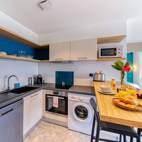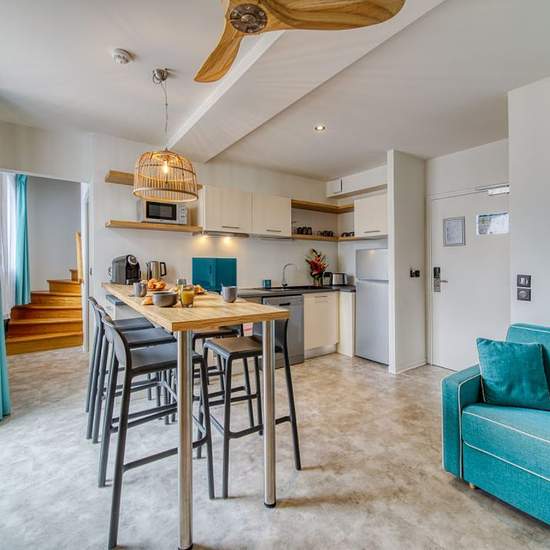 Nous disposons dans la résidence de 65 appartements T2 décorés avec goût, dans une ambiance moderne et zen avec une chambre indépendante Les équipements et la literie de qualité vous assureront un séjour en toute tranquillité Capacité : 2 à 4 personnes 1 canapé convertible avec literie de qualité 1 chambre avec lit double en 160 x 190 1 salle d'eau avec douche Avec ou sans balcon Superficie : de 45 à 83m2 Les animaux ne sont pas admis, et l'intérieur des appartements est non fumeur. La cuisine entièrement équipée (réfrigérateur, micro-ondes,...