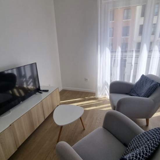 Au sein du nouvel écoquartier 'Grand Canal', dans un immeuble récent (2020), appartement lumineux de 2 pièces de 42 m2 meublé avec place de parking en s/sol : Entrée avec placard aménagé, meuble à chaussure (3 tiroirs) et meuble rangement. Cuisine américaine équipée avec électroménager : Frigo / congélateur, plaques à induction, hotte, four à chaleur tournante & pyrolyse, micro-onde et lave-vaisselle. Séjour avec salon équipé de 2 fauteuils, table basse, TV écran plat, meuble TV et salle à manger avec table pour 6 personnes. Chambre avec gra...