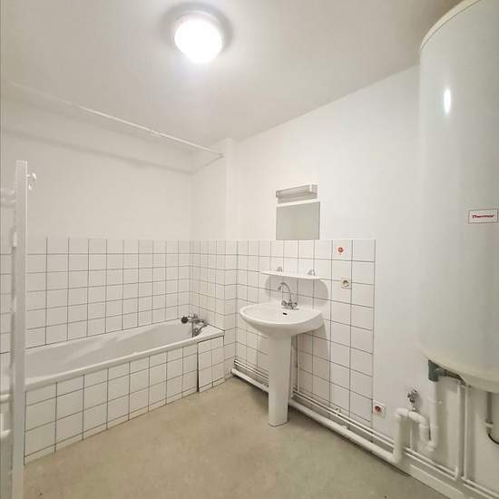 En rez-de-chaussée surélevé, appartement avec espaces verts communs comprenant : entrée avec placard, cuisine semi-équipée ouverte sur salon/séjour, 2 chambres, un cellier, une salle de bain et des wc séparés. Chauffage électrique