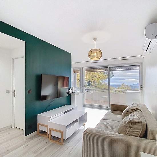 GRASSE EST Au calme, dans une résidence sécurisée, joli 2 pièces en location meublée à l'année. Cet appartement climatisé est composé d'une entrée, d'un séjour, d'une cuisine ouverte aménagée et équipée, d'une belle terrasse de 10m² offrant une très belle vue dégagée sans aucun vis-à-vis, d'une chambre, d'une salle de bains et d'un WC séparé. Une place de parking au sein de la résidence complète ce bien. Disponible immédiatement !