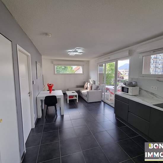 GRENOBLE - 79 avenue Léon Blum : Appartement de type T2 de 44.6m² situé dans un immeuble en copropriété au 1er étage avec ascenseur. Il se compose ainsi : une pièce à vivre comprenant un séjour (avec canapé, table basse, table et chaises) et une cuisine ouverte et équipée (réfrigérateur/congélateur, plaque de cuisson, four, hotte, micro-onde et inventaire vaisselle), une chambre avec rangements et lit, une salle d'eau avec lave-linge, un WC séparé et un grand balcon. Chauffage et au chaude individuel au gaz. Disponible actuellement. Honorair...