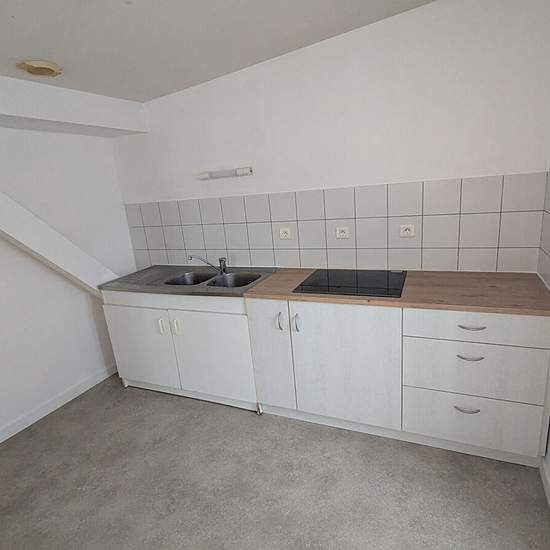 Centre ville de Josselin, appartement au 1er étage sans ascenseur offrant séjour avec coin cuisine aménagée et équipée (plaque), chambre, salle d'eau avec WC. Libre de suite