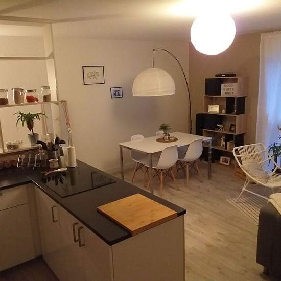 Appartement T2 duplex entièrement rénové avec goût - Il comprend un coin cuisine aménagée (avec plaque de cuisson) ouvert sur le séjour. A l'étage : Une chambre avec placard comprenant branchement et évacuation d'eau, une salle d'eau avec WC - Palier avec rangement - Cave. Chauffage électrique. Libre début novembre 2023