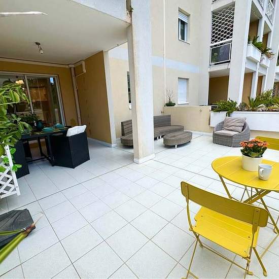 Direct propriétaire. Pas de frais d’agence. Tres beau et grand appartement T2 de 37m² avec terrace 31m², meublé, climatisé. 1200 € charges comprises. Location appartement meublé à l'année situé au rez de chaussée d'une résidence sécurisée Les Triades au Le Cannet, Secteur La Palestre au calme absolu avec une grande piscine, un beau jardin. Exposition: est sud. Il y a de nombreuses places de parking le long de la rue près de l'appartement. Entièrement refait, meublé, cuisine neuf. Proche de toutes commodités : boulangerie, pharmacie, école, s...