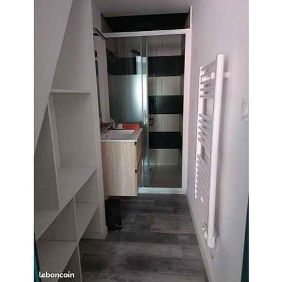 A partir du 15/11/25 loué à l'année un studio meublé avec mezzanine à Le Perrier 8km de la mer (St jean de monts) et 5 mn de Challans Le studio est composé : d'un espace cuisine équipée (frigo-congélateur, four, micro-onde, lave-vaisselle, plaque vitrocéramique, bouilloire, machine à café, grille-pain, vaisselle, etc...., Un espace salon avec TV, un canapé lit, une table basse SDE avec rangement, Toilettes avec rangement au dessus du WC, Une mezzanine avec de nombreux rangements, lit et velux Un débarras avec étagère, machine a laver, séchoi...
