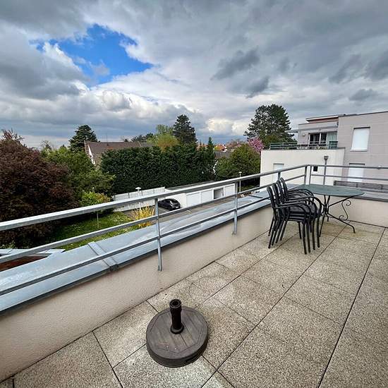 Rue de Graffenstaden - Dans résidence close, au calme Beau 2 pièces meublé en Attique (3ème étage), lumineux et traversant Ce logement de 38m² bénéficie : - d'un séjour avec cuisine équipée donnant sur un balcon de 7 m² , - d'une chambre avec accès sur une terrasse de plus de 19 m², - d'une salle-de bains avec douche et meuble vasque - d'un wc séparé. En annexe : un garage box fermé Disponible de suite Chauffage et eau chaude individuels GAZ Complément eau chaude par panneaux photovoltaïques Loyer hors charges : 705.89 euros Provision mensue...