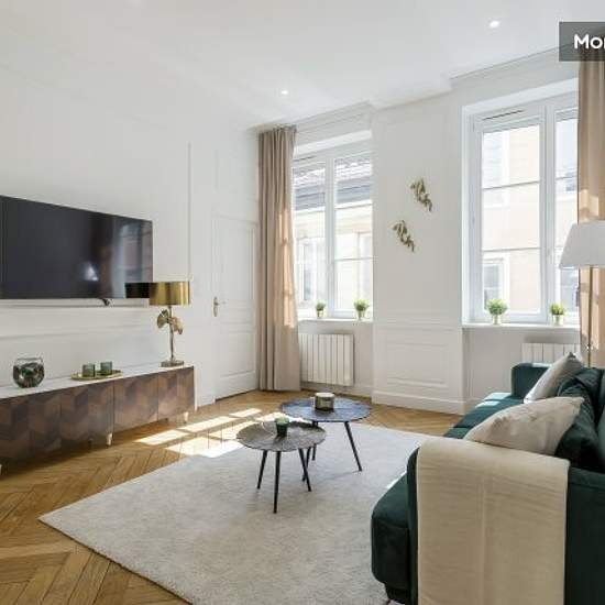 This flat of 53 m (about 570 ft) is ideally located in the 1st district of Lyon. It is composed of a very bright living space with an American kitchen opening onto the living room. There is a bedroom (double bed 140cm) with wardrobe. The flat also has a study room with an extra sofa bed. Bathroom with shower and toilet. The flat is fully equipped with washing machine, dishwasher, ironing board and iron, hair dryer, TV, etc. On the 3rd floor with lift. The rent includes a wifi internet connection, an intermediate cleaning every 2 weeks with a...