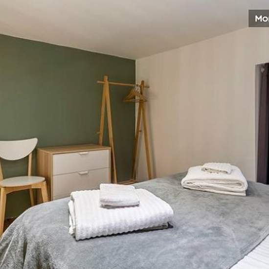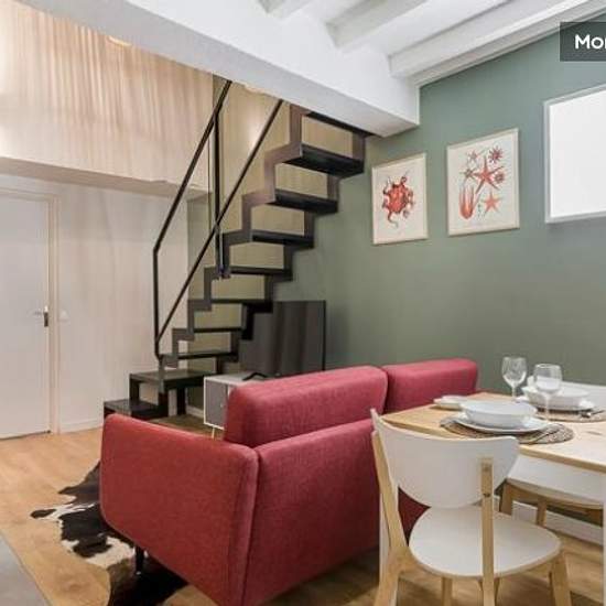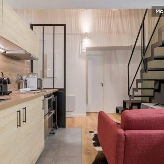 Designed by an architect, this 30m apartment is located on Place Chardonnet, at the foot of the Croix Rousse slopes. It is composed of a very pleasant living room with a large door-window to access a large patio, TV, sofa bed, dining room table, an American kitchen fully equipped (oven, refrigerator/freezer, microwave, dishwasher 6 place settings), a mezzanine bedroom (1.85m) with a double bed, a bathroom with shower, washing machine and a toilet, (iron and ironing board). Sheets and towels are provided. The rent includes a wifi internet con...