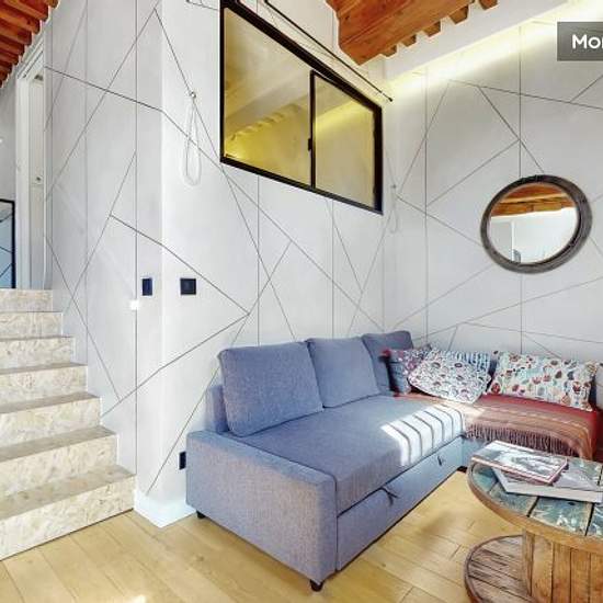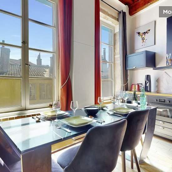 Magnificent 40m² flat with 1 bedroom and air conditioning Very high standard and lots of charm Prestigious materials, parquet flooring and exposed beams Very sunny, shared terrace with the condominiums Flat entirely overlooking the courtyard, accessed via Lyon's famous Traboules (rue Saint Georges or Montée de Gourguillon) Little surprise: an insulated wine cellar in the basement of the flat Entrance hall with large wall cupboard (access to the wine cellar) Very bright living room: sofa bed (140*200), coffee table, TV, fibre optic internet c...
