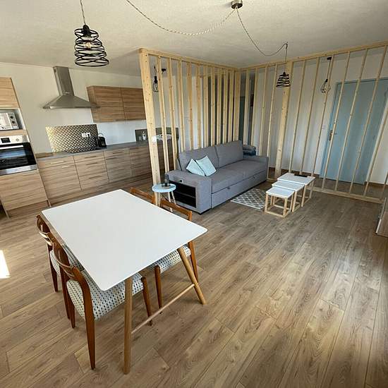 T2 Meublé, MULHOUSE CENTRE, PROCHE GARE, COMMERCES et TRANSPORTS Situé à proximité du centre historique et des rues commerçantes, bel appartement deux pièces meublé d'une surface de 54,84 m² au 7ème étage avec ascenseur. Ce logement comprend: une cuisine équipée (four électrique, plaque vitrocéramique par induction, hotte filtre à charbon; frigo avec partie freeze, micro-ondes, meubles de rangements hauts et bas) ouverte sur un spacieux et lumineux séjour de 21,50m² avec balcon, une chambre avec partie dressing, une salle d'eau (douche; meub...
