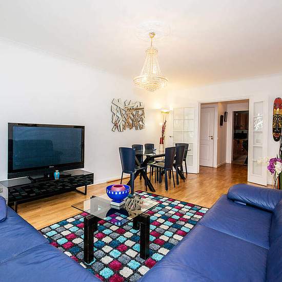 Very beautiful, spacious and comfortable two-bedroom apartment with two terraces on Rue Emeriau in the 15th district of Paris. Stylish design, excellent furniture, high quality modern home equipment; surface of the flat - 90 square meters; capacity — five people. If you come to Paris with a small company or a family, so this apartment is what you need exactly. The living\dining room with three sofas, TV, a dining table, chairs, a coffee table, lamps, paintings, decorations, carpets; two cozy bedrooms (the first has two single beds, the se...