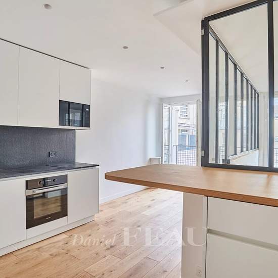 Situé le long des quais de Seine, à quelques minutes de la rue de Passy, au sixième étage avec ascenseur d'un immeuble haussmannien en pierre de taille, bel appartement entièrement rénové avec des matériaux de qualité, d'une surface de 29 m². Il se compose d'une entrée, d'une cuisine aménagée et équipée (équipements MIELE) ouverte sur le séjour, d'une chambre et d'une salle de douche avec toilettes. Chauffage et eau chaude collectifs. Lumineux et calme, entièrement sur cour. Idéal pied-à-terre. BAIL CODE CIVIL UNIQUEMENT (au nom d'une sociét...