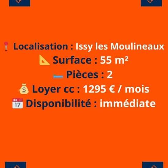 **À LOUER – T2 à Issy-les-Moulineaux** Vous recherchez un appartement confortable, bien agencé et idéalement situé ? Découvrez ce **T2 de 55 m² à Issy-les-Moulineaux**, **disponible immédiatement**. **Le bien en quelques mots :** Localisation : Issy-les-Moulineaux Surface : 55 m² Pièces : 2 Loyer charges comprises : **1 295 € / mois** Disponibilité : immédiate **Intéressé(e) ?** Contactez-nous **en message privé** ou par mail à **reseaux-** **