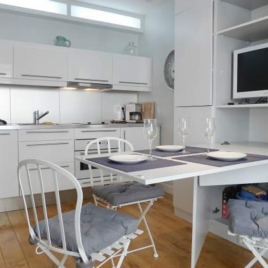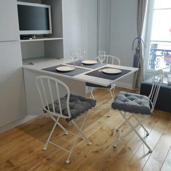 A perfectly located modern apartment This quaint, wooden floored 1 bedroom apt was carefully designed by an architect : • It sleeps 2 guests. • Located steps from the lively "Rue Lepic" and “Rue des Abbesses". • The apartment decor is tasteful and modern with a very clever use of space. • Bedroom is very calm and open. On entering into the apartment one finds a small entrance. To the right is the living room area which offers a warm comfortable seating arrangement (sofa + chairs) and a centre table. The room is also equipped with an open kit...