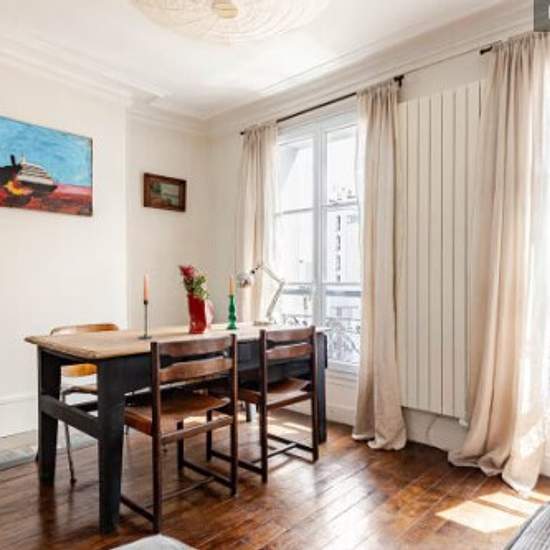 Appartement lumineux et calme de 50m², style atelier d'artiste au 5e étage sans vis-à-vis, orienté plein sud sur un paisible jardin potager de quartier et récemment rénové. On s'y sent tout de suite comme à la maison ! Bibliothèque, chaîne hi-fi, cuisine équipée, chambre calme, grande douche à l'italienne, WC séparés. Proche des métros 2, 4, 5, 7, 12 et Gare du Nord. Possibilité de se garer dans la rue, il y a toujours une place libre de stationnement gratuit, et je peux vous réserver une place de parking privé sécurisé si vous le souhaitez ...
