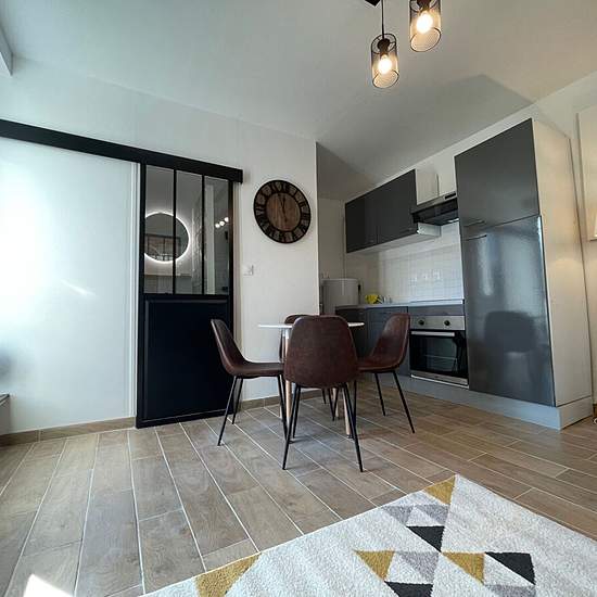 Venez visiter cet appartement 2 pièces meublé, rénové et décoré avec goût. Il comprend un séjour, un coin cuisine aménagée et équipée (plaque, hotte, micro-onde, frigo), une chambre disposant d'un lit deux places et une armoire, une salle d'eau avec WC.