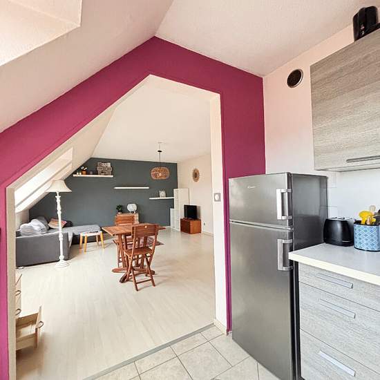 QUIMPER SUD KERDREZEC Situé au 4e étage d'un immeuble avec ascenseur, ce bel appartement T2 MEUBLE de 46,34 m² habitables et 52, 50 m² au sol offre une grande pièce de vie lumineuse avec salon-séjour et cuisine ouverte, entièrement aménagée et équipée. Il se compose également d'une chambre confortable ainsi que d'une salle d'eau avec WC. Un emplacement de stationnement privatif complète ce bien. Disponible dès maintenant !
