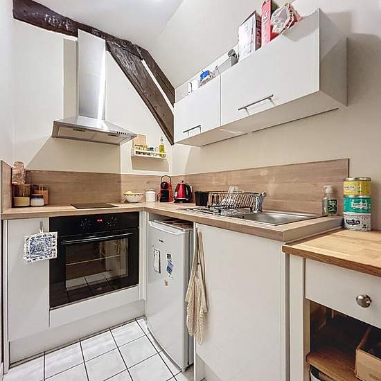 ROUEN - GROS HORLOGE Dans résidence de standing, un appartement F2 refait à neuf il y a deux ans, comprenant : une entrée avec placard, un séjour donnant sur cuisine ouverte aménagée et équipée (meubles hauts et bas, réfrigérateur, plaques de cuisson), une chambre, une salle de bain (lavabo, baignoire et branchement machine à laver) et un WC séparé. Chauffage individuel électrique *Assurance habitation à 11.46 euros / mois.